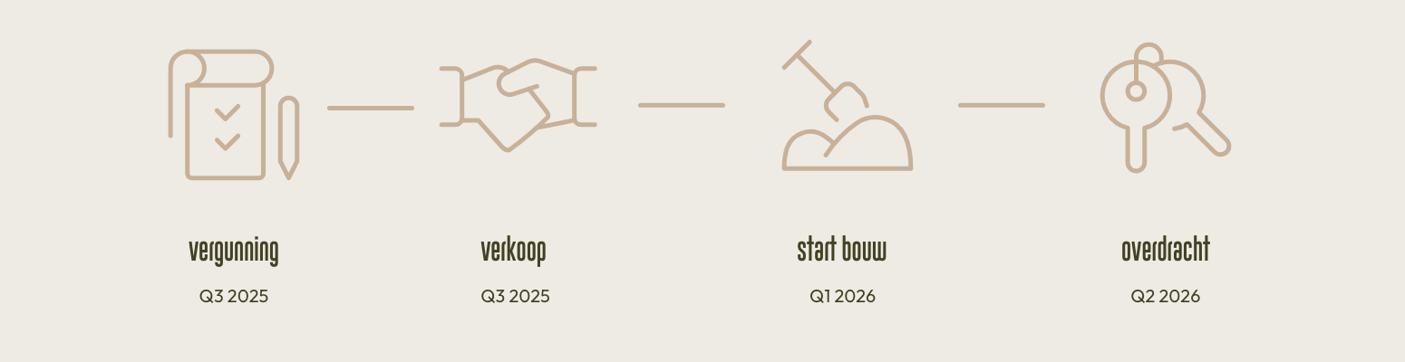 De ontwikkeling van Potmargepark verloopt in fases. In de eerste fase worden een appartementengebouw en een rij stadswoningen gerealiseerd. De bouwvergunningen zijn inmiddels aangevraagd. Als alles volgens plan verloopt, starten we in 2025 met de verkoop. In dat geval start de bouw van de eerste woningen in 2026.